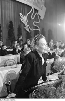 War ended in May 1945 together with the Nazi regime and Durand-Wever resumed her public role. She chaired the committee that prepared the way for the foundation of the Democratic Women's League ("Demokratischer Frauenbund Deutschlands" / DFD), which was formally established in March 1947.[2] With what remained of Germany divided into four military occupation zones the DFD was apparently viewed with equanimity or favour by all the occupying powers, and she held high office within it.[8] Increasingly, however, it became a creature of the newly formed ruling Socialist Unity Party (SED) in the Soviet occupation zone (after 1949 East Germany): it was subsequently banned entirely in what became, after 1949, West Germany. In 1949 or early 1950 Durand-Wever resigned all her offices with the DFD on grounds of overwork and health, and later in 1950 she left the organisation.[2]