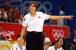 Upon her retirement as a player, she became an assistant coach at ODU from 1989 to 1995, then head coach at East Carolina University from 1995 to 1998, reaching the Colonial Athletic Association finals against her alma mater, Old Dominion.[1] Her coaching career moved to the professional ranks via a brief stint with the American Basketball League's Philadelphia Rage in 1997–98.[1] As the ABL folded, she joined the rival WNBA as an assistant coach for the expansion Indiana Fever. With coach Nell Fortner leading the U.S. Olympic team, Donovan served as interim head coach for the Fever for the 2000 season. She then led the Charlotte Sting to the WNBA Finals in 2001, losing to the Los Angeles Sparks. In 2002, she led the Sting to an 18–14 record, losing to the Washington Mystics in the first round of playoffs.[1]
