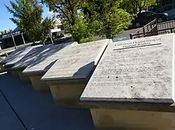 The Anne Frank Human Rights Memorial is a .81 acres (0.33 ha) cenotaph complex and educational park in Boise, Idaho near the Boise Public Library and the Greenbelt, the centerpiece of which is a statue of Anne Frank. The complex is jointly maintained by the Wassmuth Center for Human Rights and the Boise Department of Parks and Recreation, and is the only Anne Frank memorial in the U.S.[1] Designed by Idaho Falls architect Kurt Karst, a sapling of the Anne Frank Tree and quotations from some sixty notables and unknowns (including poets, activists, politicians and diplomats, those who survived the Holocaust, and those who did not) are prominent installations.[2] It also features one of the few installations where the full text of the Universal Declaration of Human Rights is on permanent public display. The park has been recognized and accepted by the International Coalition of Sites of Conscience.[3] It was thoroughly renovated in September 2018, with an outdoor classroom and a new sculpture, "The Spiral of Injustice."[4]