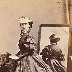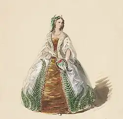 In the year that she married, she had a dress design created for her by the Russian-born artist Nicholas Chevalier. It was intended as fancy dress and featured fern-inspired designs; its construction included sheepskin and gemstones. The dress has been cited as an example of pteridomania.[6] Chevalier also designed a lyrebird-inspired fan as an accessory to the outfit.[6] It appears that she never wore the dress as she chose to appear as a "Marquise of the Court of Louis XV" for the Mayor's Ball in 1863. Chevalier's dress design was rejected by Barkly but they collaborated to work on a present for the newly married Princess of Wales. The present was from the women of Victoria and like the dress the silver and gold flower stand featured icons of Australian life.[7]