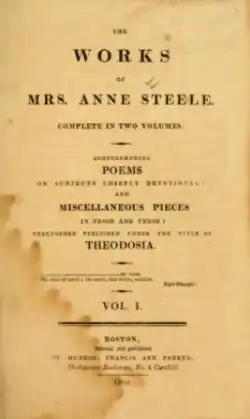 In 1760, two volumes, appeared under the title of Poems on Subjects chiefly Devotional, by Theodosia.[4] After her death, which occurred in 1778, a new edition was published with an additional volume and a Preface by the Rev. Dr. Caleb Evans of Bristol (Bristol, 1780). In the three volumes, there are 144 hymns, 34 Psalms in verse, and about 30 short poems. They were reprinted in one volume by D. Sedgwick, 1863. Steele's hymns were first made available for congregational use in 1769, 62 of them being then introduced into the Bristol Baptist Collections of Ash & Evans, the letter T for "Theodosia" being affixed; 47 were also given in Dr. Rippon's Selections, 1787, and 26 in Dr. W. B. Collyer's Collections, 1812.[4] The original edition of "Theodosia"'s works are kept in the Library of the Baptist College, Bristol.[5]