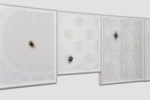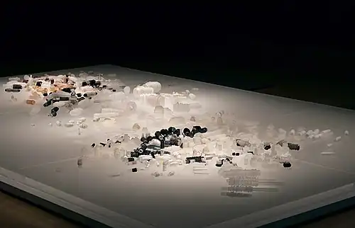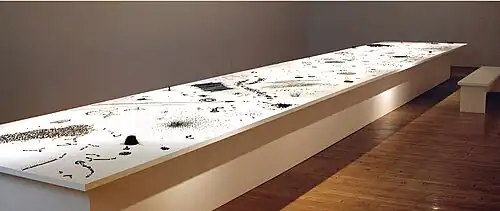 In 2002, Wilson began the series Topologies (2002-ongoing) at the Whitney Museum of American Art's Biennial exhibition. In Topologies, expansive networks of found black lace are deconstructed to create large horizontal topographies. Some of the structures are formed by Wilson from computer-mediated scans of lace fragments that are manipulated and re-materialized by hand stitching. The form of Topologies is inspired by forms of physical and electronic networks, city structures, immateriality, biology and the urban sprawl.[9][12][13]