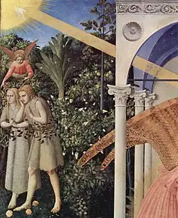 The scenes have a structure similar to the other two Annunciations but with some differences. As in the Annunciation of Cortona, the pictured surface is divided in three parts (the garden, the Angel's arch and the Virgin's arch), but the vanishing point is inside the home, as in the Annunciation of San Giovanni, focusing the viewer's attention on the Annunciation. This scheme draws attention away from the figures of Adam and Eve expelled from Eden, which in the Cortonese Annunciation are smaller but are near the vanishing point.