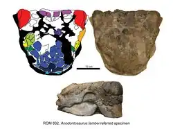 Anodontosaurus was named by Charles Mortram Sternberg in 1928, based on holotype CMN 8530, a partially preserved skeleton including the skull, half ring, armor and other postcranial remains.[4] The badly crushed[1] skeleton was collected by Sternberg in 1916 from a Canadian Museum of Nature quarry, 8 miles southwest of Morrin.[4] It was collected from the upper part of the Lower Horseshoe Canyon Formation (unit 2), dating to the latest Campanian to the earliest Maastrichtian stage of the Late Cretaceous period, about 71-70.2 million years ago.[1][5] The generic name means "toothless lizard" in Ancient Greek. It was inspired by the fact that compression damage to the specimen had removed the teeth, at the same time shifting various flat round elements below the skull and on top of the left lower jaw, misleading Sternberg into assuming that large "trituration plates" had replaced the normal dentition.[6] The specific name, lambei, honours Lawrence Morris Lambe, the Canadian geologist and palaeontologist from the Geological Survey of Canada where the holotype was reposited.[4]