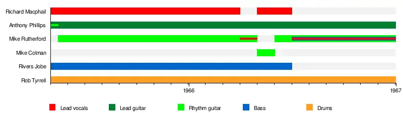- Mike Rutherford – rhythm guitar (May 1965 – Spring 1966, Spring 1966 – December 1966), lead vocals (Spring 1966, July 1966 – December 1966), bass (July 1966 – December 1966)