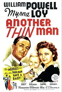 Another Thin Man is a 1939 American detective film directed by W. S. Van Dyke, the third of six in the Thin Man series. It again stars William Powell and Myrna Loy as Nick and Nora Charles and is based on Dashiell Hammett's Continental Op story "The Farewell Murder".[2] The Charles' son Nicky Jr. is introduced for the first time. The cast includes their terrier Asta, Virginia Grey, Otto Kruger, C. Aubrey Smith, Ruth Hussey, Nat Pendleton, Patric Knowles, Sheldon Leonard, Tom Neal, Phyllis Gordon and Marjorie Main. Shemp Howard, later of The Three Stooges, appears in an uncredited role as Wacky.[3][4]