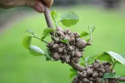 Cutting off vine stems near the ground is generally ineffective as a control measure; the severed upper portion can remain alive in a tree canopy, for up to two years—during which time it will continue to drop aerial tubers—and the plant readily re-establishes new vine stems from its subterranean tubers.[21] Success has been achieved in killing the severed upper portion, including the aerial tubers, using a "cut and feed" approach that involves placing the upper cut end into a cup containing 5% glyphosate solution for a period of up to two months.[9]