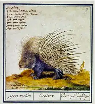 De Boodt also made many watercolours of native and exotic animals and plants. He filled twelve volumes with 728 illustrations of quadrupeds, reptiles, birds, fish, insects and plants. He thus aimed to depict all creatures of the natural world as his compatriot Joris Hoefnagel who was also working at Rudolph II's court had done earlier in his series of the Four Elements. De Boodt's volumes can be regarded as a paper museum.