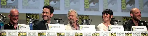 Additionally, John Slattery and Hayley Atwell reprise their roles as Howard Stark and Peggy Carter, respectively, from previous MCU media.[50][51] Slattery stated that his involvement in Ant-Man was "not that much more" than his participation in Iron Man 2 (2010),[52] while Atwell described her appearance as being "more of a cameo".[51] Gregg Turkington appears as Dale, the manager of a Baskin-Robbins store;[36][53][54] and Martin Donovan plays Mitchell Carson, a former member of S.H.I.E.L.D. who works for Hydra and looks to purchase the Yellowjacket technology.[55][56] YouTuber Anna Akana portrays a writer in Luis' story at the end of the film.[57] Garrett Morris, who portrayed Ant-Man in a Saturday Night Live sketch in the 70s, appears as a taxi driver.[58] Ant-Man co-creator Stan Lee makes a cameo appearance in the film as a bartender.[59] Chris Evans and Sebastian Stan make uncredited appearances during the post-credits scene as Steve Rogers and Bucky Barnes, respectively.[60] Hayley Lovitt makes a nonspeaking cameo as Janet van Dyne / Wasp.[61] Lovitt was cast for her "saucer-like, Michelle Pfeiffer eyes", since Pfeiffer was Reed's dream casting for Wasp; Pfeiffer would later be cast as the character for the sequel Ant-Man and the Wasp (2018).[62] Tom Kenny provides the voice of a toy rabbit that Scott gives to Cassie.[63] Comedian Tom Scharpling portrayed someone selling a lottery ticket to Lang, in a scene that was cut from the theatrical release.[64]