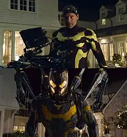 A former systems engineer at VistaCorp and petty criminal who acquires a suit that allows him to shrink in size but increase in strength.[7][8][9][10][11] Regarding Rudd's casting, producer Kevin Feige said, "Look at that origin of the petty crook who comes into contact with a suit and does his best to make good, and then look at someone like Paul Rudd, who can do slightly unsavory things like break into people's houses and still be charming and who you root for and whose redemption you will find satisfaction in".[8] Director Peyton Reed compared Lang to George Clooney's character Danny Ocean from Ocean's Eleven (2001), saying, "He's a guy trying to create a new life for himself and find redemption." To get in shape for the role, Rudd worked with trainers and cut alcohol, fried foods, and carbohydrates out of his diet.[12] Rudd stated that in preparation for his role, he "basically didn't eat anything for about a year ... I took the Chris Pratt approach to training for an action movie. Eliminate anything fun for a year and then you can play a hero".[13] Rudd signed a multi-film contract with Marvel Studios, with Feige saying it was "three [films]-plus-plus to appear in other things".[14] - Evangeline Lilly as Hope van Dyne: