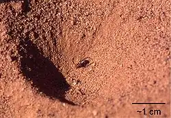 Funnel-shaped pits are built by members of just 3 antlion tribes: Myrmeleontini, Myrmecaelurini, and Nesoleontini.[21] In these trap-building species, an average-sized larva digs a pit about 2 in (5 cm) deep and 3 in (7.5 cm) wide at the edge. This behavior has also been observed in the Vermileonidae (Diptera), whose larvae dig the same sort of pit to feed on ants. Having marked out the chosen site with a circular groove,[22] the antlion larva begins to crawl backward, using its abdomen as a plough to dig up the soil. Using one of its front legs, it places heaps of loosened particles upon its head which it then flicks clear of the scene of operations. Continuing in this way, it gradually works its way from the circumference toward the center.[2] As it slowly moves round and round, the pit gradually gets deeper and deeper, until the slope angle reaches the critical angle of repose (that is, the steepest angle the sand can maintain, where it is on the verge of collapse from slight disturbance), and the pit is solely lined by fine grains.[23] By digging in a spiral when constructing its pit, the antlion minimises the time needed to complete the pit.[23]