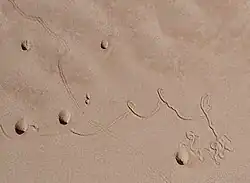 The exact meaning of the name "antlion" is uncertain. It has been thought to refer to ants forming a large percentage of the prey of the insect, the suffix "lion" merely suggesting "destroyer" or "hunter".[2] In any case, the term seems to go back to classical antiquity.[3] The antlion larva is often called a "doodlebug" in North America because of the odd winding, spiralling trails it leaves in the sand while relocating, which look as if someone has been doodling.[4]