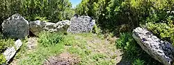 The Anta is hidden by a clump of trees about 100 metres to the south of the Cave of Salemas. It is one of several archaeological sites within the same area, including the cave. Although probably identified by the 19th-century Portuguese archaeologist, Carlos Ribeiro, it was first studied and drawn on 17 January 1944 by the German archaeologists, Georg and Vera Leisner, but no excavations were carried out until November 1959 when Vera Leisner and O. V. Ferreira made some limited excavations and corrected the previous plan. These led them to describe the dolmen as a polygonal chamber necropolis without the usual entrance corridor associated with similar dolmens in the area. They estimated its dimensions as being 5.5 metres by 5 metres, with a maximum height of two metres. Five limestone slabs of the Late Cretaceous epoch survive on the site, one of which is believed to have been the roof of the tomb. Although further research has yet to be carried out, other archaeologists believe that further excavation could result in the discovery of an access corridor.[1][2][3]