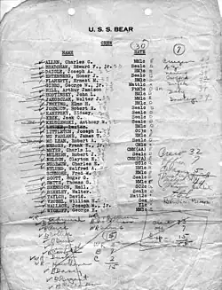 The Team brought along a newly designed Antarctic Snow Cruiser which had smooth tract-less tires which made it difficult to grip onto the Antarctic ice.[19] Due to this problem and constant repair and maintenance on the tires, the vehicle was abandoned when the expedition team evacuated.[20] It was found years later during Operation Highjump and once more in 1958. It is now suspected to be lost to the sea or buried under mounds of ice and snow.[21] The crew of the mission, which included Richard Black and Paul Siple,[22] conducted multiple experiments and observations including collecting samples of plants, algae, and lichen.[23] The mission resulted in a better understanding of polar science.[24] With World War II ramping up, the U.S. government deemed it wise to evacuate the two bases. West Base cleared on 1 February 1941, and East Base followed suite on 22 March 1941. The ships USMS North Star and Bear of Oakland arrived on 5 May 1941 and 18 May 1941, respectively.[25]