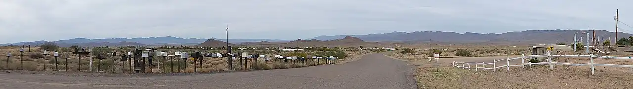 Most of the buildings in Antares lie to the west of Antares Road, though there are some in the southeast corner, some in the tourist spots in the center-south on Route 66, and a few buildings on the extension of Boulder Road that lies to the northwest of the village limits.[11] Mailboxes for the residents all lie at the Route 66–Antares Road intersection.[12]