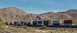 The village of Antares began as a railroad siding.[6] The Atlantic and Pacific Railroad was laying tracks through the area in 1883 and had to reroute around the Peacock Mountains, diverting south of the mountains to the easier gradient through nearby Hackberry; when continuing west, the gradient was lower in the Hualapai Valley 6 miles (10 km) to the north of Hackberry, where Antares now lies. The railroad thus took a large curve to travel through this point down into Kingman. The siding built on the curve became incorporated as Antares after the National Old Trails Highway was constructed in 1910, following the railroad in this part of Arizona; when Route 66 was built in 1926 it also ran parallel to the railroad.[5] Antares was first recorded as a "town and railroad station" in the United States Geological Survey of 1923.[7]