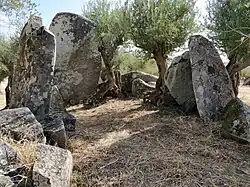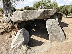 The Antas do Olival da Pêga are 2 dolmens located near the village of Telheiro, in the municipality of Reguengos de Monsaraz, in Évora, Portugal. Anta is the Portuguese name for a dolmen, a single-chamber megalithic tomb. These two Neolithic dolmens were used over a long period, from the Late Neolithic to the Chalcolithic. The tombs were originally identified by German archaeologists Georg and Vera Leisner, who excavated Anta 1, with Anta 2 being subsequently excavated from the 1990s by Victor Gonçalves and Ana Catarina Sousa of the Centre of Archaeology of the University of Lisbon (UNIARQ). In addition to the visible stones at the two sites, which are about 300 meters apart, many items have been found as a result of excavations. Over one hundred people were buried in each tomb. The proximity of the two tombs gives rise to the conclusion that both were part of the same megalithic complex.[1][2]