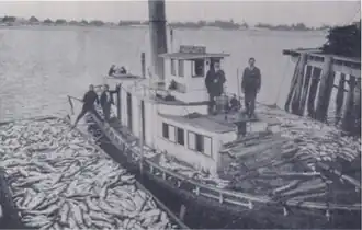 In October 1906, Antelope was in service again as a fishing tender, under the command of Capt. Orsan R. "Ott" Willard.[15] On Saturday, October 21, 1906, 7000 salmon were caught and delivered to the salmon cannery in Bandon, Oregon, and nearly as many were delivered to the cannery at Prosper.[15] On Sunday, October 22, a photograph was taken of Ott Willard, his crew and their "floating palace", the Antelope, with two scows loaded with salmon lashed alongside, as they came to the dock in Bandon.[15]
