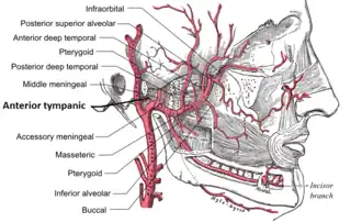 ![]() Branches of maxillary artery (anterior tympanic artery at upper left) | |