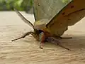 The adult moth's wingspan is about 70 mm for males and 100 mm for females.