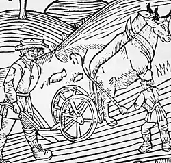 While The Boke of Husbandry gave a clear and minute description of the rural practices of that period, from The Boke of Surveying and Improvements, may be learned a good deal of the economy of the feudal system in its decline. The first 1523 editions of the books are very rare. The 1523 edition of the Boke of Husbandry is remarkable for the engraving upon the title page, representing two oxen drawing a plough with drivers.[8] The author writes from his own experience of more than forty years; and, if we except his biblical allusions, and some vestiges of the superstition of the Roman writers about the influence of the moon. Early 19th century John Claudius Loudon explained:[7]