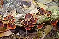 Fruit bodies are rust coloured to dark red, and are fan shaped. They grow in groups on dead twigs.[6] Caps are on average 3–20 mm (0.1–0.8 in) diameter.[7][2] Horizontal caps are attached laterally to substrate and are sessile with a very small thickened stem like point. Shapes range from reniform to almost circular, convex,[6] and almost symmetrical, deeply grooved radiating from point of attachment, following gill outline [7] Pileus is coloured creamy pale pink to reddish brown, and smooth, when young covered in scaly whitish dust.[4] Gills are orange to brown, widely spaced,[3] and radiating from the pale, thickened point of attachment to the substrate.[6] Spores are translucent, 7.5–12.5 μm long, and 5–8 μm wide,[3][7] with a white spore print. Context is 1–2 mm (0.04–0.08 in) thick, and pale with a thickened wall.[4]