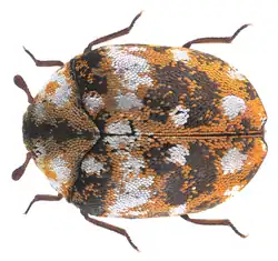 Anthrenus flavipes is a species of beetle in the family Dermestidae known by the common name furniture carpet beetle. It has a cosmopolitan distribution, occurring throughout the world, being most active in warmer climates.[1] It is a pest that damages household materials such as textiles.