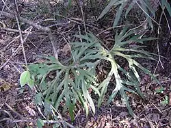 Anthurium podophyllum is a species of plant in the genus Anthurium native to coastal areas of the Mexican states of Veracruz and Oaxaca.[1] A terrestrial species, it grows in tropical forest understories in seasonally dry areas. It is named for its palmate leaves that somewhat resemble plants in the (unrelated) genus Podophyllum, and which have many subdivisions.[2] It is related to other terrestrial Anthurium with similar leaf morphology in the section Schizoplacium, such as Anthurium pedoradiatum,[3] and produces orange berries.[4]