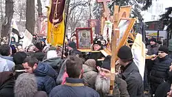On 25 November in Sevastopol the Russian Bloc and the Communist Party of Ukraine organised an "antimaidan".[64] The meeting was conducted in support of joining the Customs Union of Belarus, Kazakhstan, and Russia.[64] Previous rallies by the Russian Bloc in the weeks prior included EU flag burning and anti-government, and anti-Ukrainian rhetoric,[65][nb 1] On 26 November, another antimaidan protest was organised in Donetsk, attracting only 30 student protesters. Organisers stated that the European Union had ruined the economies of new members, and that joining would bring corruption and gay marriage.[67] The protest was counter to the pro-EU EuroMaidan protest 200 meters away, which attracted no more than 50 protesters. The next day, a small antimaidan rally was held by the Russian Bloc and Communists in Mykolaiv.[68] At a 25 November rally in Luhansk, protesters were met with resistance from a group of Don Cossacks, who were against EU membership and referred to pro-EU protesters as fascists.[69]