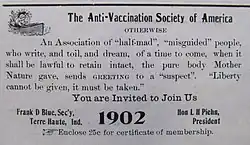 Anti-Vaccination Society of America opposed compulsory smallpox vaccination from the final decades of the 19th century through the 1910s.[1] It was founded in 1879 after a visit to the United States by William Tebb.[2] It published a periodical called Vaccination.[3]