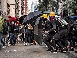 On 4 October 2019, the Government of Hong Kong invoked the rarely used colonial-era Emergency Regulations Ordinance to implement the Prohibition on Face Covering Regulation (PFCR), an anti-mask law[46] in response to the ongoing protest that year. The law bans protesters from covering their faces whether in full or partially during protests, including at rallies given a "Letter of No Objection" under the Public Order Ordinance.[47] Anyone who wears a mask at a lawful rally or march, unlawful or unauthorised assembly, or during a riot could be sentenced to up to a year in jail and a fine of HK$25,000. Exemptions include those at protests wearing masks for professional or paid work, or for religious or medical reasons.