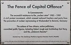 In 2000, PLAGE erected the resistance monument against the WAA at Mozartplatz in Salzburg. "The Fence of Capital Offence" should commemorate the successful resistance to the WAA 1985-1989 - a civil protest movement, which crossed national frontiers and party lines.