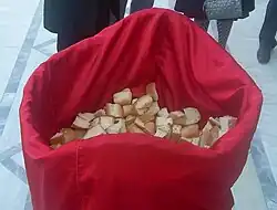 The antidoron (Greek: Ἀντίδωρον, Antídōron) is ordinary leavened bread which is blessed but not consecrated and distributed in certain Eastern Orthodox Churches and certain Eastern Catholic Churches that use the Byzantine Rite. It comes from the remains of the loaves of bread (prosphora) from which portions are cut for consecration as the Eucharist during the Divine Liturgy. The word Ἀντίδωρον means "instead of gifts", i.e., "instead of the Eucharistic gifts".