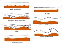 An antidune is a bedform found in fluvial and other channeled environments. Antidunes occur in supercritical flow, meaning that the Froude number is greater than 1.0 or the flow velocity exceeds the wave velocity; this is also known as upper flow regime. In antidunes, sediment is deposited on the upstream (stoss) side and eroded from the downstream (lee) side, opposite lower flow regime bedforms. As a result, antidunes migrate in an upstream direction, counter to the current flow. Antidunes are called in-phase bedforms, meaning that the water surface elevation mimics the bed elevation; this is due to the supercritical flow regime. Antidune bedforms evolve rapidly, growing in amplitude as they migrate upstream. The resultant wave at the water's surface also increases in amplitude. When that wave becomes unstable, breaks and washes downstream, much of the antidune bedform may be destroyed.