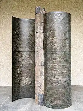 This sculpture consists of two copper curved pieces attached to a piece of petrified wood by steel bands. The "scrolls" have letters punched into them, one piece is in English and the other piece is "coded" in Cyrillic.[1][2]