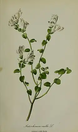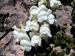 Antirrhinum molle, the dwarf snapdragon, is a species of flowering plant in the family Plantaginaceae.[2] It is native to northeastern Portugal, the central and eastern Pyrenees, and adjacent areas of northern Spain.[1] Available from commercial suppliers, it is a semi‑evergreen subshrub reaching 15 to 20 cm (6 to 8 in), with 3 cm (1.2 in) white to pale pink flowers.[2]