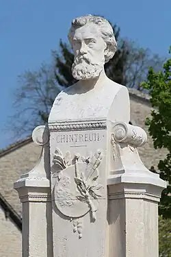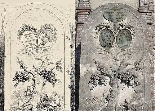Desbrosses also worked to have a monument to Chintreuil erected in his hometown of Pont-de-Vaux; the inauguration of Chintreuil's bust (by Jean-Baptiste Baujault) in the Place des Cordeliers took place on May 5, 1879.[60] Another elaborate monument was erected at Chintreuil's grave in Septeuil, sculpted by Louis-Charles Levé, in 1874; after Desbrosses died in 1906 he was buried alongside Chintreuil and a bronze plaque of his face was added next to that of Chintreuil. "The master and the disciple lie side by side, united forever in the stillness of death as they had been so long in the ties of life. Madame Desbrosses, wife of one and nurse of the other, is also buried there."[61]