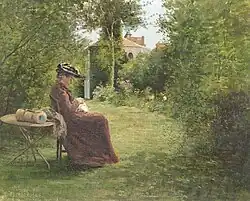 At some point after 1857,[40] Jean Desbrosses married Antoinette Éloin, who was nine years older than him. Henriet writes that "Desbrosses married without separating from Chintreuil, for the delicate devotion of his wife respected ties so close and so dear."[41] She is thought to be the subject of Desbrosses' painting at the Musée d'Orsay that depicts a woman seated in the garden at La Tournelle, her face in profile. The author Caroline de Beaulieu, who was a contemporary and thus may have known her, says she was "an intelligent woman with a brave heart."[42] Except to act as a nurse to Chintreuil, Antoinette's role in the ménage is unclear. The Desbrosses were apparently childless. When Antoinette died in 1892, she was buried in the plot that would eventually hold both her husband and Chintreuil; the monument depicts the two artists but does not mention her.[43]