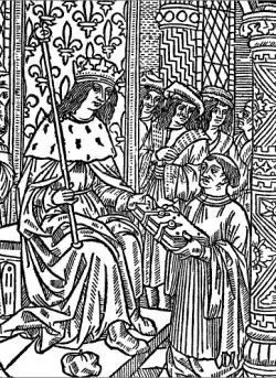 Vérard worked for a leisured bourgeois and noble public, notably king Charles VIII of France and even Henry VII of England. He did not hesitate to offer luscious examples of his work to the king of France, such as a Légende dorée, by Jacobus de Voragine, published in 1493 and offered to Charles VIII and his wife Anne de Bretagne.[2] He did not hesitate to pirate his fellow printers works he saw good work that could sell. He thus took into his business one of the era's great publishing successes, the Calendriers des bergers, originally published by Guy Marchant.[3]