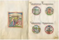 Anton Pelchinger (died 18 September 1465) was a Bavarian Benedictine monk, artist and writer. He was born at Hofen, near Bad Aibling. He entered Tegernsee Abbey in 1442.[1] There he served as Kapellmeister, chorister, organist and teacher of music.[2] He also worked as a manuscript illustrator at Tegernsee and at Andechs Abbey. His illustrations are of high quality.[1] In 1458 he went on a pilgrimage to the Holy Land, departing from Venice. He wrote a conventional description of Jerusalem and the Christian holy places.[a] He does not include any personal details, but identifies himself as a professor of Tegernsee. One manuscript of this work is in the Austrian National Library in Vienna (no. 3012) and there may be another in the Bavarian State Library in Munich.[3]