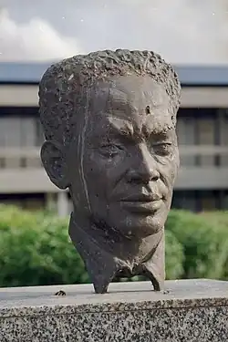 Part of his unpublished novel Ons bloed is rood (Our blood is red) appeared in Adek (1983).[5] In 1988, the Surinamese Worker and Unemployed Organisation (SAWO) submitted a motion with the municipality of Amsterdam to name a square after Anton de Kom. A square in Amsterdam-Zuidoost near the shopping centre was renamed Anton de Komplein.[18] The square features a sculpture of Anton de Kom as a monument to his life and works, sculpted by Jikke van Loon.[19] SAWO went on to petition the Government for rehabilitation.[18]