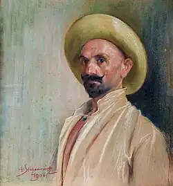 His parents, Kajetan and Emilia, were major landowners. From 1876 to 1879, he studied at the Academy of Fine Arts, Vienna, with Carl Wurzinger, Christian Griepenkerl, and August Eisenmenger. After graduating, he worked as a teacher of drawing in Drohobycz.[1] His first showing came in 1883, at an exhibition of the Kraków Society of Friends of Fine Arts, and was awarded the title of Professor in 1887. He left Drohobycz in 1893, to take a similar teaching position in Lwów. That same year he became a member, then deputy director of the Examination Commission for Teachers; a position he held until 1905. From 1902, he was a member of the National School Council, and was instrumental in reorganizing the methods of drawing instruction.[1] He also wrote two drawing textbooks for teachers.