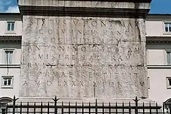 Originally, the pedestal bore reliefs of garland-bearing victories on three sides and subdued barbarians on the side facing the Via Flaminia.[7] During Fontana's works, these were chiseled away, and the superstructure encased in marble.[8] The marble casing carries Latin inscriptions, one of which misidentifies the monument as the Column of Antoninus Pius.[9]