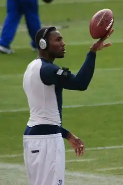 Antonio Cromartie Sr. (born April 15, 1984) is an American former professional football player who was a cornerback in the National Football League (NFL). He played college football for the Florida State Seminoles and was selected in the first round by the San Diego Chargers in the 2006 NFL draft.[1] He was selected to four Pro Bowls and was a first-team All-Pro in 2007 after leading the league in interceptions. He also played for the Arizona Cardinals, New York Jets and Indianapolis Colts. Cromartie holds the record for the longest scoring play in NFL history after returning a missed field goal 109 yards for a touchdown in 2007.[2] After his playing career, he was a graduate assistant for the Texas A&M Aggies.