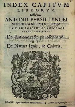 - ^ "Antonius Persius vixi annis LXIX. mensibus VIII. diebus V. Ad plures abij anno salutis 1612. XI kalendas Februarias", Index capitum librorum Abbatis Antonii Persii lyncei De ratione recte philosophandi et de natura ignis, et caloris, Romae, apud I. Mascardum 1613, p. 6 n.n.