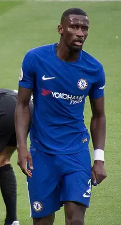 On 9 July 2017, Rüdiger joined Chelsea from Roma for a reported initial fee of £29 million on a five-year deal.[21] He was given the number 2 shirt.[22] He made his debut on 6 August as a substitute replacing Marcos Alonso in the 79th minute in a 4–1 loss on penalties to Arsenal in the 2017 FA Community Shield.[23] He made his Premier League debut six days later in a 3–2 defeat against Burnley at Stamford Bridge.[24] He scored his first goal for Chelsea in the round of 16 of the EFL Cup in a 2–1 win over Everton,[25] and his first league goal was the only one of a home win over Swansea City on 29 November 2017.[26] On 20 October 2018, Rüdiger scored his first goal of the season, opening the scoring in a 2–2 home draw against Manchester United.[27]