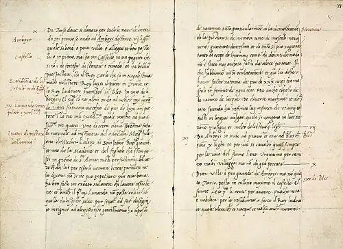 The language of the diary is the vernacular of Apulia, since De Beatis claims that his knowledge of Latin and Tuscan is inadequate. In an introductory letter to one of the 1521 copies, he states that he kept the diary at the cardinal's urging.[1] It consists mainly of notes made at the time based on firsthand witness or, as De Beatis says, reports by "persons of great authority and worthy of all trust and belief". It does not appear to have undergone heavy editing or to be heavily indebted to written sources.[3]