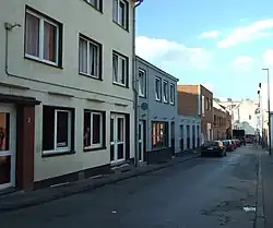 There was a settlement at the location of today's road from the time of the Roman Empire. When the foundations for the "Germania Fischhallen" were dug in 1905, numerous vessels and remains of walls from Roman and medieval times were found.[2] Excavations to reroute a sewer in 2014 found a Roman iron smelting fire-pit in the street.[3] The street was named Hurengasse in the Middle Ages and early modern times, referring to brothels in the street during the period. The location of the "pleasure trade" in the street was probably due to its close proximity to the two spa districts on the Büchel and in Komphausbadstrasse.[a] It was renamed to Antoniusstraße in 1872 after the City Council obtained royal approval.[5] It is named after Saint Anthony of Padua, who campaigned for the poor and for prostitutes.
