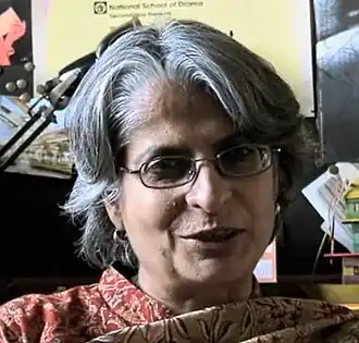 Anuradha Kapur is an Indian theatre director and professor of drama. She taught at the National School of Drama (NSD) for over three decades and was the Director of National School of Drama for six years (2007–2013). For her work as a theatre director, the Sangeet Natak Akademi Award was conferred on her in 2004.[1] In 2016, she was awarded the J. Vasanthan Lifetime Achievement Award for excellence in theatre.[2] Her work as a director is noted for its open and interactive nature.