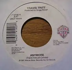 "Anymore" is a song co-written and recorded by American country music artist Travis Tritt. It was released in September 1991 as the second single from his album It's All About to Change. It peaked at No. 1 in both the United States and Canada, becoming his second of such in the United States, and his fourth in Canada. The song was written by Tritt and Jill Colucci.